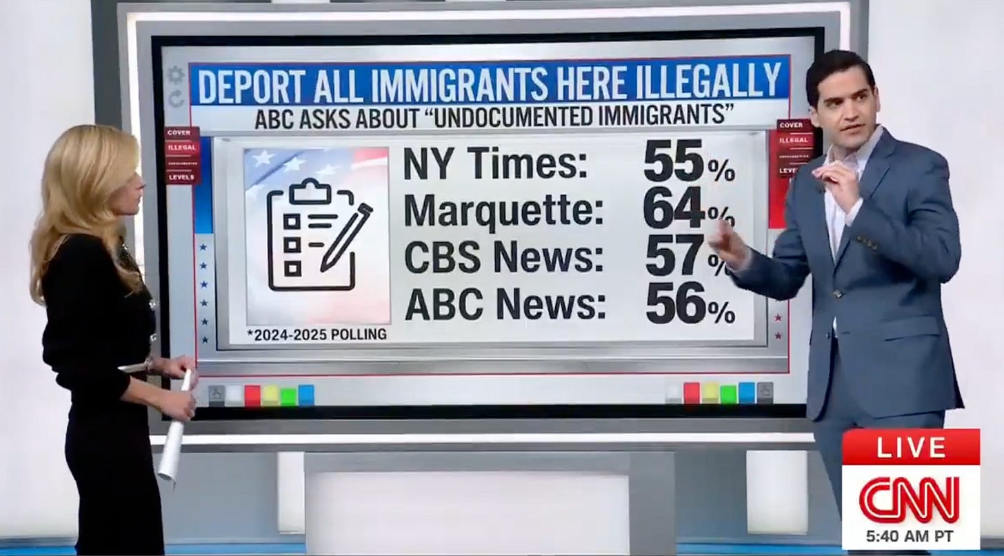 Recently, CNN’s Harry Enten unveiled four separate polls that all found that most Americans support Trump’s mass deportation agenda. Marquette’s results were the most pronounced, with a whopping 64 percent of respondents saying they want to deport all illegal immigrants. The New York Times had a smaller share of respondents favoring mass deportation, though still a majority at 55 percent.